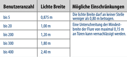 Sicherheit: Büroräume sollen nicht nur angenehm für den Mitarbeiter sein und zu einem guten Arbeitsklima beitragen, Unternehmer und Arbeitgeber sind zudem dazu verpflichtet, Vorkehrungen zu treffen, die es den Mitarbeitern ermöglichen, sich bei Gefahr unverzüglich in Sicherheit zu bringen. Exakte Maße zu Höhen und Breiten von diesen Fluchtwegen sind in den ASR-Richtwerten ASR A2.3 „Fluchtwege und Notausgänge, Flucht- und Rettungsplan“ konkretisiert. Ein Verkehrsweg, der zugleich Fluchtweg für maximal 5 Personen ist, muss diesen Richtwerten entsprechend mindestens 0,875 m breit sein, ab 400 Mitarbeitern, die denselben Fluchtweg benutzen, muss seine Breite mindestens 2,40m betragen.