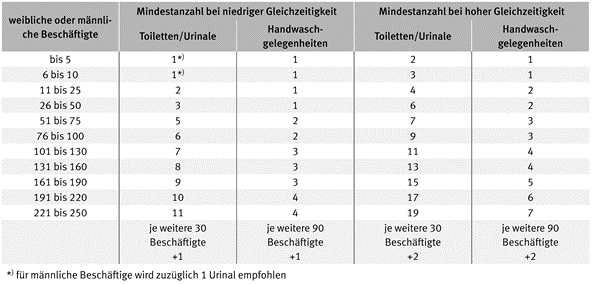Sanitärräume: Auch für Sanitärräume gibt es Vorschriften zu beachten. Für weibliche und männliche Beschäftigte sind getrennte Sanitärräume einzurichten. In Betrieben mit bis zu neun Beschäftigten kann auf getrennt eingerichtete Toiletten-, und Waschräume für weibliche und männliche Beschäftigte verzichtet werden, wenn eine zeitlich getrennte Nutzung sichergestellt ist. Bei bis zu 10 Mitarbeitern ist eine Handwaschgelegenheit und eine Toilette ausreichend, wenn die Nutzer zu 50% weiblich und zu 50% männlich sind (ein zusätzliches Urinal wird empfohlen).