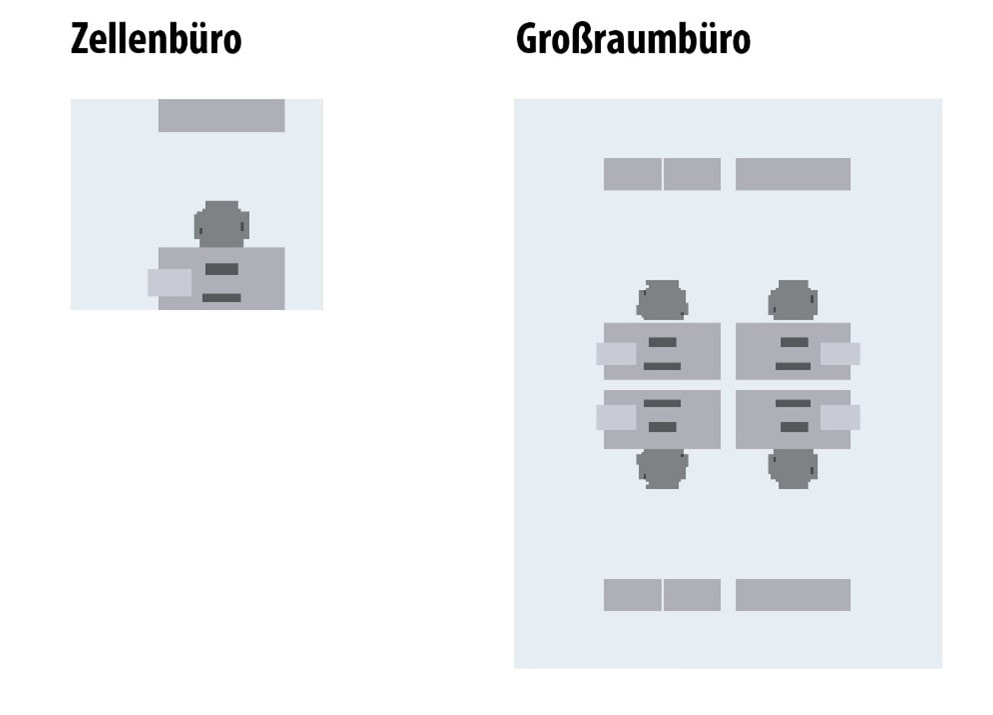 Großraumbüros haben im Vergleich zu Zellenbüros einen höheren Flächenbedarf, der sich aus der Notwendigkeit von zusätzlichen Verkehrswegen und trennenden Elementen zwischen einzelnen Arbeitsgruppen ergibt.