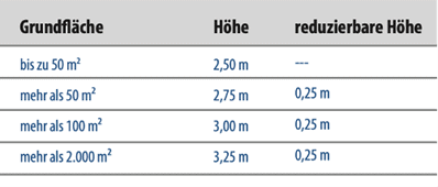 Auch die Raumhöhe von Büros unterliegt den technischen Richtlinien für Arbeitsstätten. Bei einer Grundfläche von bis zu 50 m2 muss die Raumhöhe mindestens 2,50 m betragen, in großen Büros von mehr als 2.000 m2 darf eine Höhe von 3,25 m nicht unterschritten werden. In bestimmten Fällen kann die Mindesthöhe zwar um 0,25 m reduziert werden, jedoch darf auch in diesem Fall die Mindesthöhe von 2,50 m nicht unterschritten werden. Die Unterschreitung der Mindesthöhe gem. ASR bedingt eine Gefährdungsbeurteilung der betroffenen Arbeitsplätze.