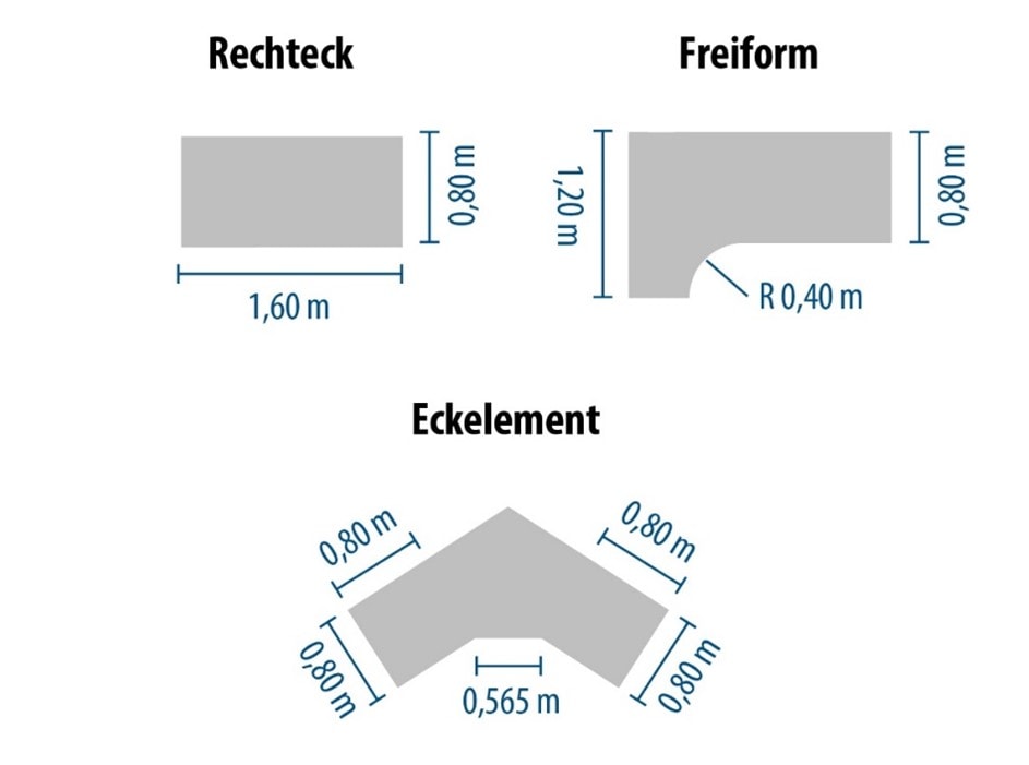 Bei Freiformen ist zudem zu beachten, dass eine ungeteilte Arbeitsfläche von mindestens 0,80 m Breite vorgesehen werden muss und die Tiefe des Tisches an keiner Stelle weniger als 0,80 m betragen darf. Eine Ausnahme stellt nur der Eckbereich dar, in dem die Breite auf bis zu 0,565 m reduziert werden kann.