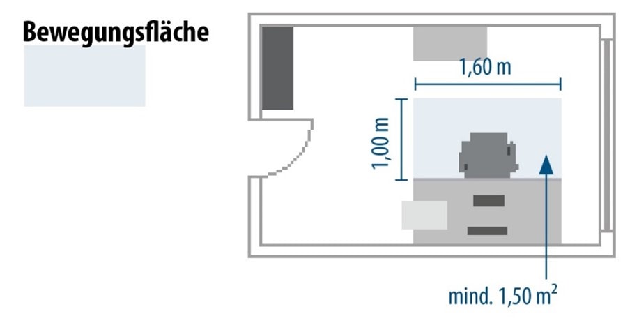 Bewegungsflächen: Als Bewegungsfläche wird die zusammenhängende unverstellte Bodenfläche am Arbeitsplatz bezeichnet, die den Mitarbeitern bei ihrer Tätigkeit wechselnde Arbeitshaltungen sowie Ausgleichsbewegungen ermöglicht. Jeder Mitarbeiter muss sich am Arbeitsplatz frei bewegen können, wodurch ihm an regelmäßig genutzten Arbeitsplätzen mindestens 1,50 m2 unverstellte Bodenfläche als Bewegungsfläche zur Verfügung stehen muss. Die Form der Bewegungsfläche ist nicht vorgegeben: Bewegungsflächen können eher breit oder eher tief, rechteckig oder gebogen sein, solange sie eine Mindesttiefe von 1,00 m aufweisen. Die Bewegungsflächen dürfen mit Ausnahme der Benutzerflächen des eigenen Arbeitsplatzes nicht verstellt oder überlagert werden.