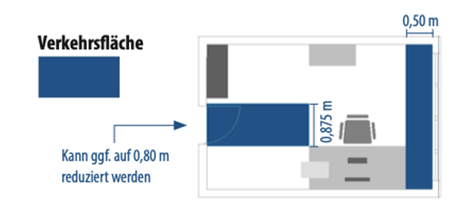 Verkehrsflächen: Verkehrsflächen sind Bodenflächen, die ausschließlich für den Fußgängerverkehr bestimmt sind. Gänge zu persönlich genutzten Arbeitsplätzen müssen mindestens 0,60 m breit sein, für Wartungsgänge und Gänge zu gelegentlich genutzten Betriebseinrichtungen gilt eine Mindestbreite von mindestens 0,50 m. Auf diese kann nur dann verzichtet werden, wenn alle Bedienelemente frei zugänglich sind. Die Verkehrsfläche darf sich grundsätzlich nicht mit anderen Flächenarten überlagern. Eine Ausnahme besteht lediglich bei der Überlagerung mit der Benutzerfläche von gelegentlich genutzten Schränken, nicht jedoch mit deren Funktionsfläche.