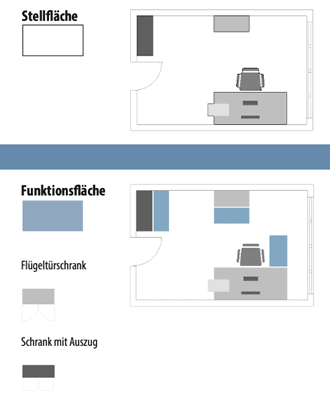Funktionsflächen: Funktionsflächen sind Bodenflächen, die von beweglichen Teilen der Arbeitsmittel, Einbauten und Einrichtungen überdeckt werden. Wie auch bei Stellflächen wird die Größe der Funktionsflächen durch das Möbel selbst vorgegeben. Für die Ermittlung der Funktionsflächen müssen die Flächen für alle Betriebszustände, auch für Instandhaltung und Werkzeugwechsel, berücksichtigt werden. Für Schränke mit Flügeltüren wird daher beispielsweise die komplette Fläche berechnet, die beim Öffnen der Türen in Anspruch genommen wird. Grundsätzlich dürfen sich Möbelfunktionsflächen nicht mit anderen Funktionsflächen und Flächenarten überlagern. Eine Ausnahme besteht, wenn Möbel nur an einem Arbeitsplatz genutzt werden. Möbel, die mehreren Personen zugeordnet sind, fallen ebenfalls in diese Kategorie, sofern sie nicht gleichzeitig und nur gelegentlich genutzt werden.