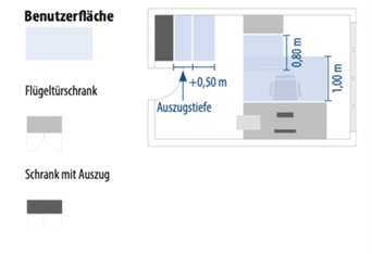 Die Anforderungen an Benutzerflächen sind nicht als spezifische Regeln in der allgemein formulierten ASR A1.2 enthalten. Im Sinne der ArbStättV sind sie bei der Planung von Büroarbeitsplätzen dennoch zu berücksichtigen. Für Flügeltürschränke und Regale sollten eine Benutzerfläche mit einer Mindesttiefe von 0,80 m berechnet werden, während bei Schränken mit Auszug zusätzlich zur Auszugstiefe ein Abstand von 0,50 m einkalkuliert werden sollte.