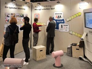 An seinem Stand stellte Eurocres die Idee des Activity Based Working (ABW) heraus: ein Arbeitsplatzkonzept für flexible, vielfältige und vor allem flächeneffiziente Arbeitswelten zum Zusammenarbeiten. Ausgangspunkt bei ABW ist die Erkenntnis, dass die Interaktion zwischen den Mitarbeitern 80 Prozent aller Innovationen hervorruft. Allein unter diesem Gesichtspunkt kann Eurocres Büroflächen und deren Belegung planen, und zwar mit ActivityCode®, einem seiner computergestützten und hauseigenen Tools. Mit dem Tool lassen sich 40 Prozent Flächeneinsparung erzielen. Der branchenführende ActivityCode® erfasst alle Aktivitäten: Telefonate, Individualarbeit und die gesamte Zusammenarbeit der Belegschaft. Aus diesen Berechnungen ergeben sich die Raummodule, die auf Schautafeln den Besuchern am Messestand vorgeführt wurden. Ein typischer Arbeitstag der zwei Beispielpersonen Max und Lara wurde dort lehrreich durchdekliniert, anhand der Aufgaben und der Kommunikationsbeziehungen – und den entsprechenden Räumen und dem Mobiliar, wie Arbeitsnische, Arbeitsplatz, Besprechung am Tresen, Besuch der Coffeebar oder des ThinkTanks.
