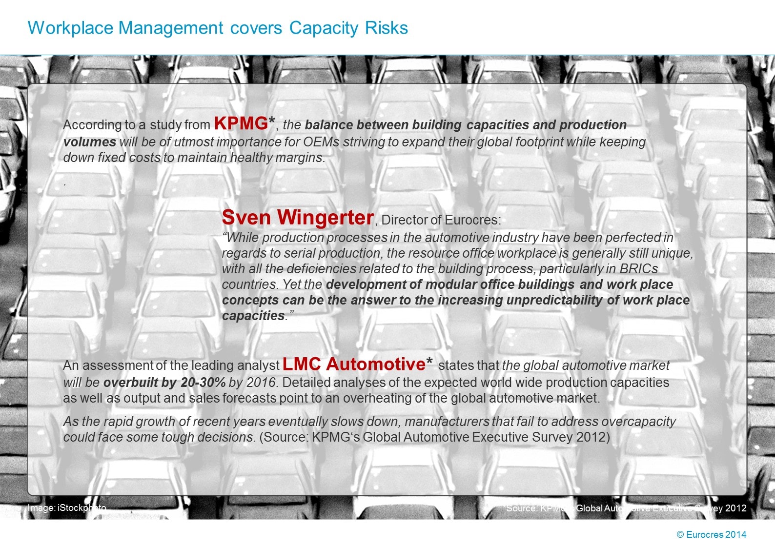 Knowledge-portal > Wissensportal > WorkPlace Flash: Workplace Management covers Capacity Risks +++ Continuous production growth in automotive sector +++ Predicted overcapacities of up to 30% expected globally by 2016 +++ Serial modular office concepts facilitate healthy step-by-step adaption to growth and regression +++ DOWNLOAD DOWNLOAD WorkPlace Flash: Workplace Management covers Capacity Risks2014-03-202018-12-02https://eurocres.expertdeal.nl/wp-content/uploads/logo-3-weiss-np01-140905_01.pngEurocreshttps://eurocres.expertdeal.nl/wp-content/uploads/eurocresworkplaceflash006-presentationslide-1024x768.jpg200px200px