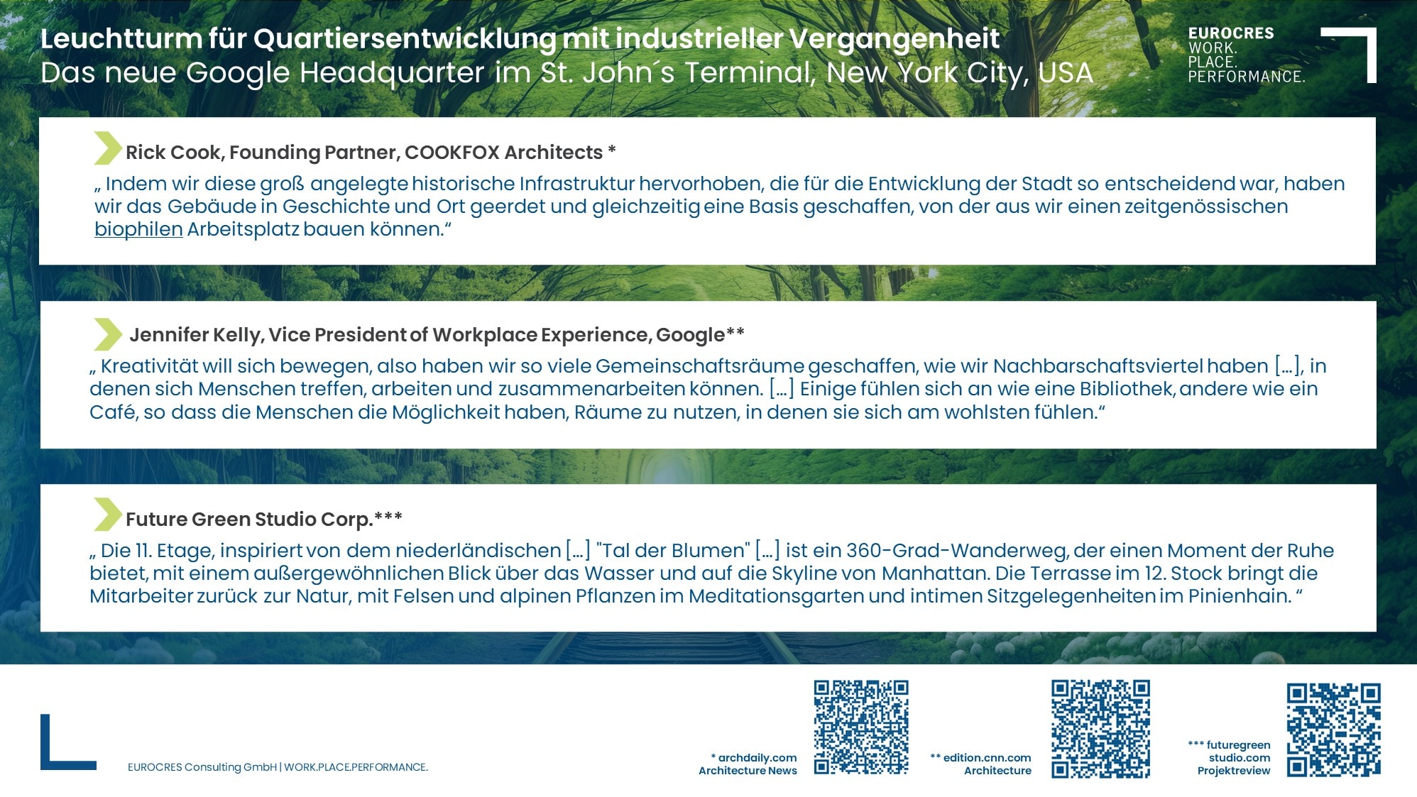 - Umnutzung altes Zugterminal in biophiles Bürogebäude: 1,5 ha neue Außenflächen mit 95% heimischen Pflanzen, neue Fußgängerverbindung am Hudson River, vielfältiges Angebot für Outdoor-Working