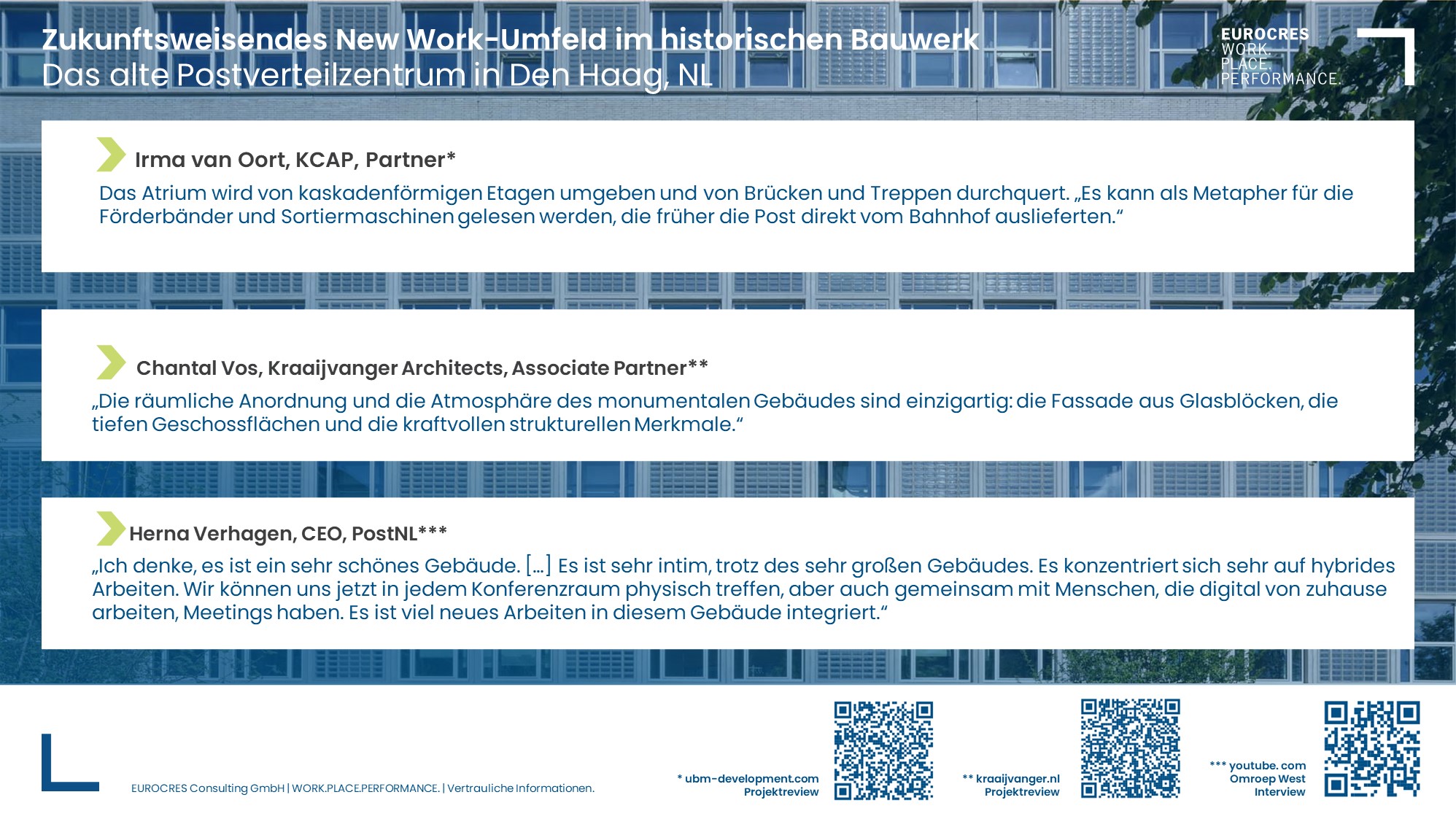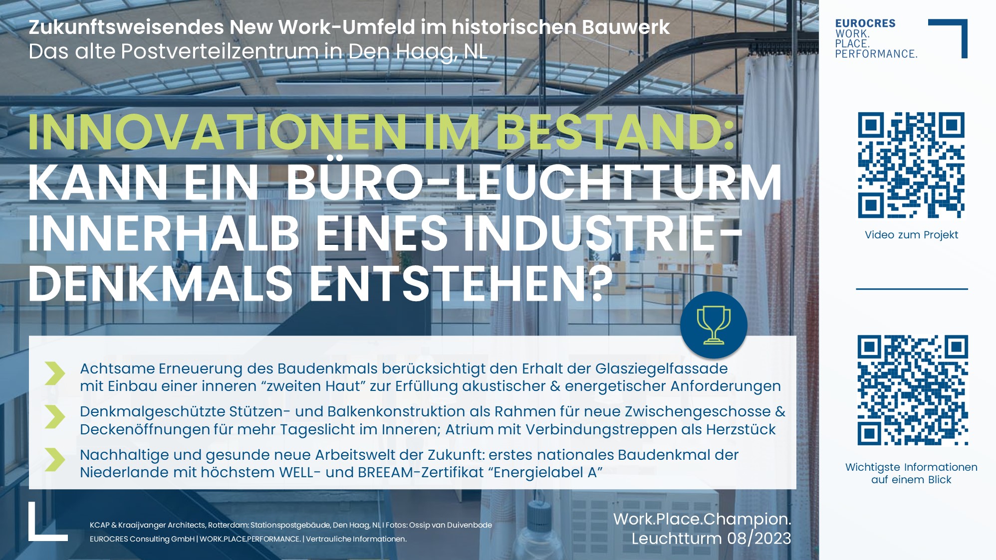 Das Stationspostgebouw dient nun als Hauptsitz der Post. Gleichzeitig stehen auch Coworking-Spaces und mietbare Räume für andere Nutzer zur Verfügung. Trotz der gewaltigen Dimensionen ist es den Architekten gelungen, Räume für all jene Attribute zu schaffen, die ein „New Work“-Umfeld ausmachen: flexible Zusammenarbeit, vielseitige Nutzung und Wohlbefinden der Mitarbeiter. Ein Vorbild für nachhaltige und gesunde neue Arbeitswelten und gleichzeitig das erste nationale Baudenkmal der Niederlande mit höchstem WELL-und BREEAM-Zertifikat “Energielabel A”.