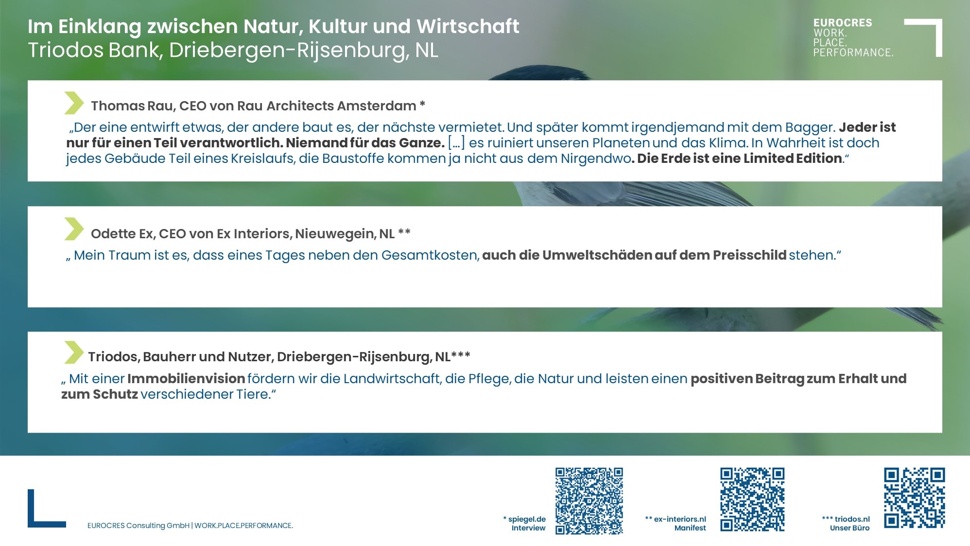 Wenn sich die Höhe eines neuen Gebäudes an Flugrouten für Fledermäuse orientiert, liegt es nahe, dass sich der Architekt grundsätzliche Gedanken über die Folgen für die direkte Umwelt gemacht hat. Bei einem Objekt von Thomas Rau ist dies allerdings kein Wunder – er gilt als Vordenker der Kreislaufwirtschaft am Bau. Die Erde und auch ein Gebäude sind für ihn eine „limited edition“, eine zeitlich begrenzte Kombination aus Materialien, Produkten und Komponenten. Auch unser aktuelles Leuchtturmprojekt, der Hauptsitz der Triodos-Bank in Driebergen-Rijsenburg in den Niederlanden, kann mit diesen Attributen aufwarten. Der 13.000 Quadratmeter-Bau auf einem ehemaligen Landsitz verschmilzt Dank seiner betörend-geschwungenen Formen mit der Umgebung.