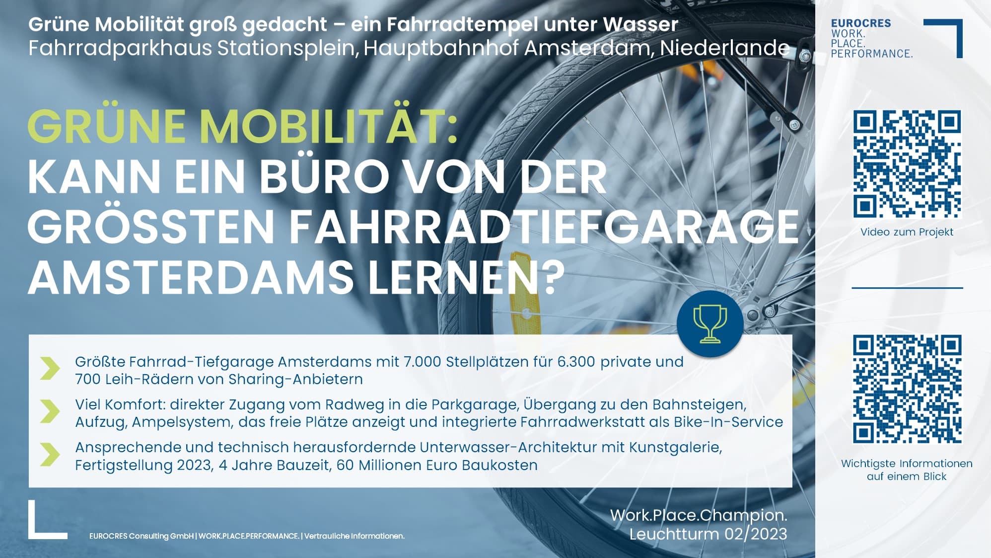 Heute berichten wir einmal nicht gleich direkt über einen Bürohaus-Leuchtturm, sondern eine Lösung für Menschen, die umweltschonend ins Büro fahren: ein Fahrradtempel unter Wasser am Hauptbahnhof Amsterdams. Wieder ein Vorzeigeprojekt aus den Niederlanden. Das Ende Januar 2023 eingeweihte Fahrradparkhaus Stationsplein ist die größte Fahrradtiefgarage Amsterdams mit 7.000 Stellplätzen für 6.300 private und 700 Leihräder. Über eine riesige Rampe besteht ein attraktiver und direkter Zugang vom Radweg in die Parkgarage. Ein Ampelsystem zeigt freie Plätze an, eine Fahrradwerkstatt ist selbstverständlich integriert.