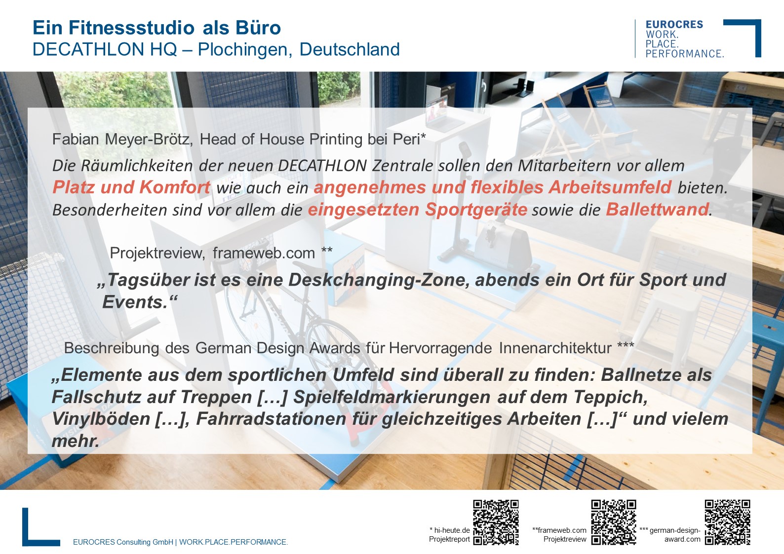 Dass Bürogemeinschaften gemeinsam Sport treiben, ist ein alter Hut. Doch eine ins Bürohaus integrierte Sporthalle? Solch eine Errungenschaft gibt es wohl nur bei einem Unternehmen, das auch geschäftlich damit zu tun hat: Decathlon. Der internationale Hersteller und Händler von Sportgeräten und -bekleidung hat 2018 in seinem Deutschland-Hauptquartier in Plochingen bei Stuttgart Sport und Büroarbeit direkt miteinander verbunden. Herausgekommen ist eine mobile und flexible Möblierung à la „tagsüber Desksharing, abends ein Ort für Sport und Events.“ Die Fitnessgeräte und -elemente wurden daher direkt in die Arbeitsumgebung integriert: Spielfeldmarkierungen auf dem Teppich, Ballnetze als Fallschutz bei Treppen und als Clou eine Ballettwand. Dafür gab es auch den German Design Award für „Hervorragende Innenarchitektur“.