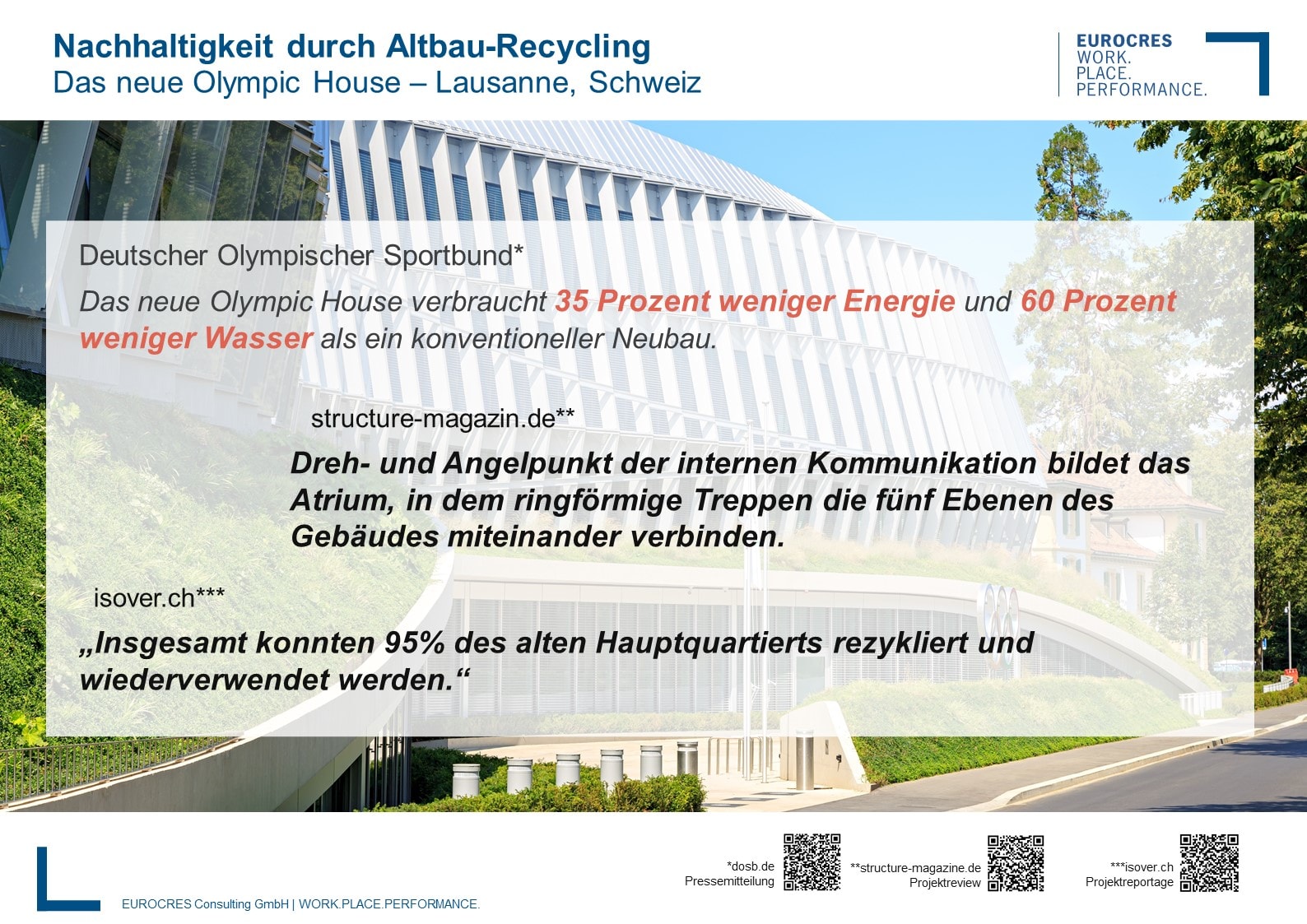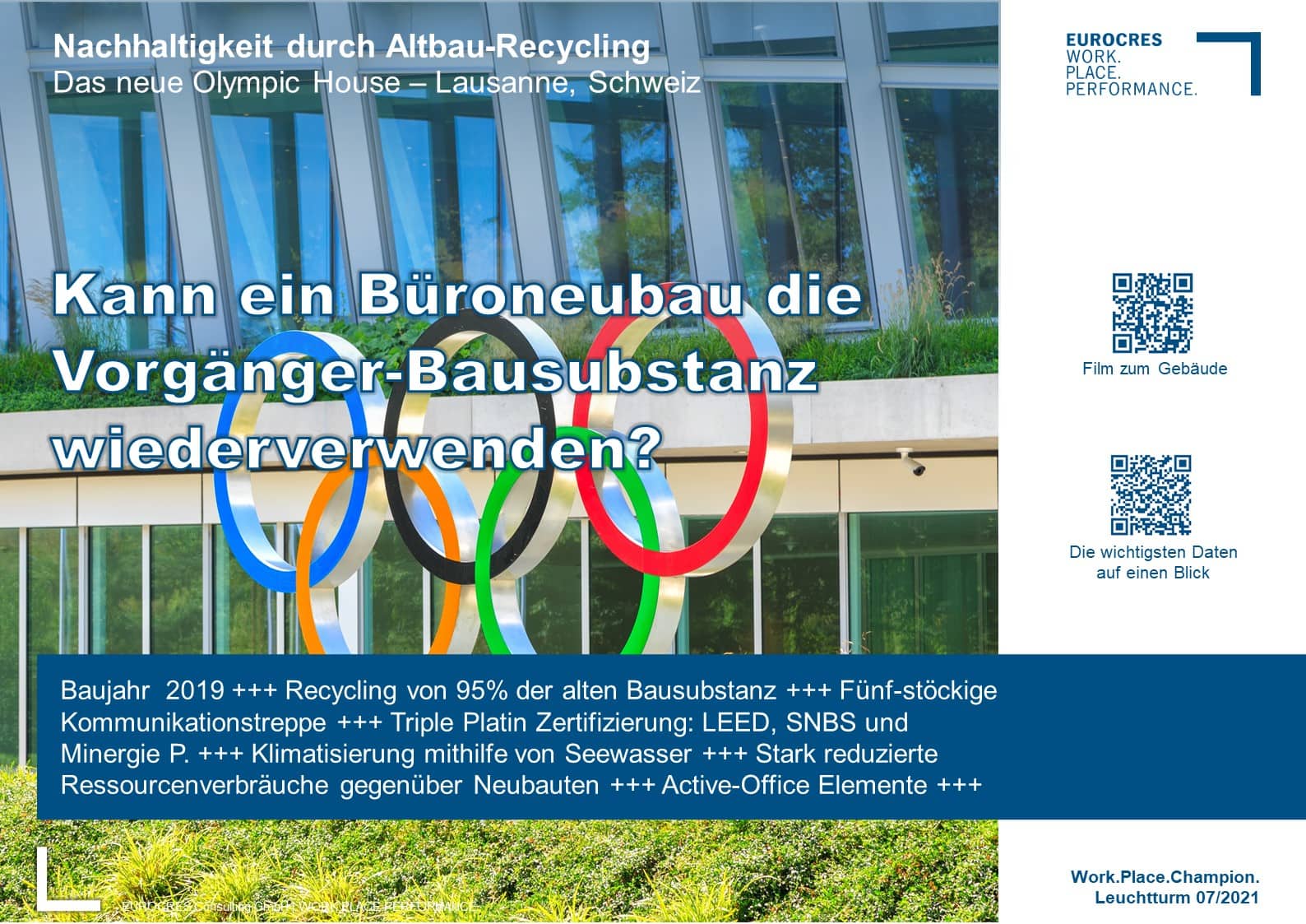 Passend zur derzeitigen Olympiade in Japan, freuen wir uns Ihnen das IOC-Hauptquartier im Schweizer Lausanne vorzustellen. Das 2019 erbaute Olympic House für 500 Mitarbeiter sammelte ordentlich Top-Architekturpreise und Nachhaltigkeitszertifikate ein, darunter den Award „Best Office Future Project“. Einen dreifachen olympischen Erfolg gab es auch bei der Zertifizierung: SNBS Platinum (Standard Nachhaltiges Bauen Schweiz), der Schweizer Standard Minergie P und vor allem LEED v4 Platinum mit der bis dahin höchsten Punktezahl 93 – was für Ressourcenschonung, Senkung des CO2-Ausstoßes und nachhaltige Bauverfahren steht.