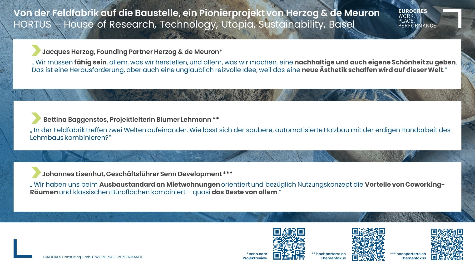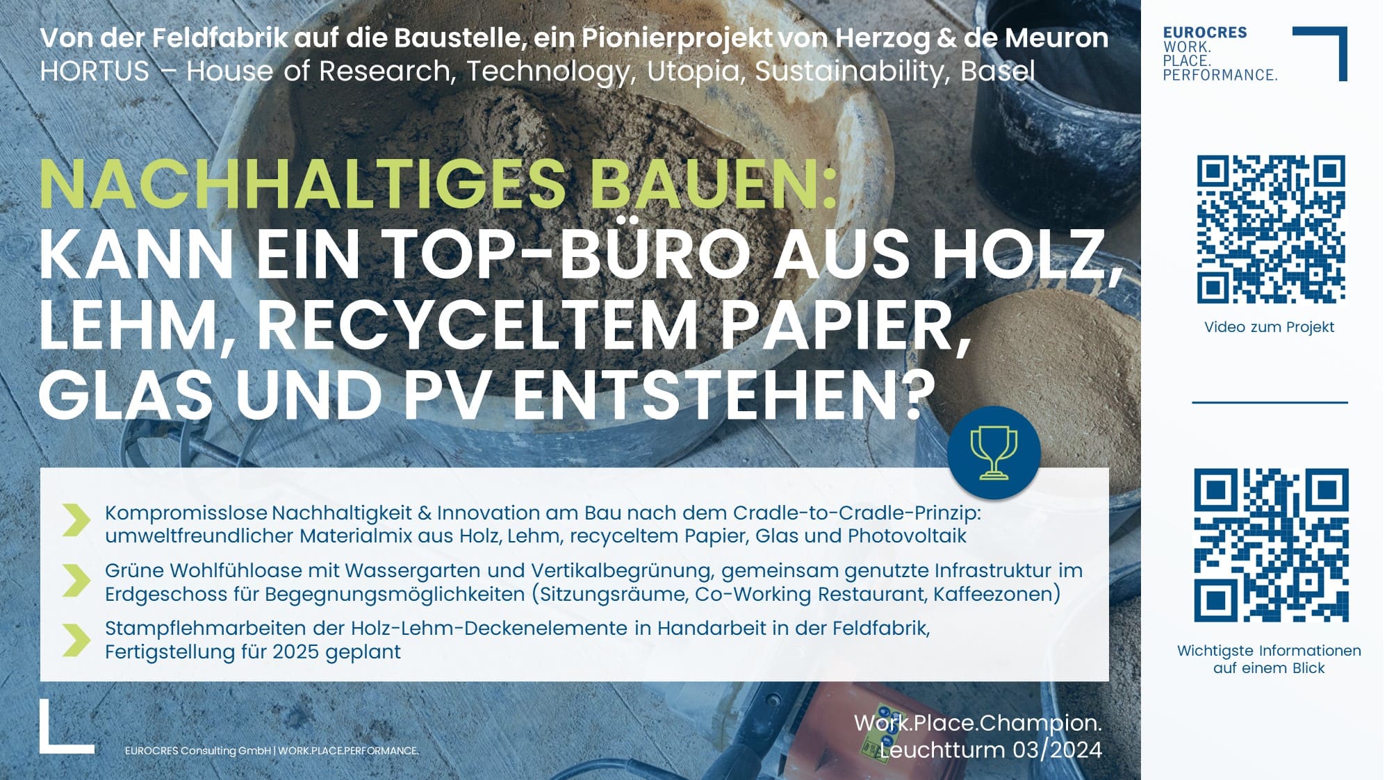 Kompromisslose Nachhaltigkeit, Innovationen am Bau und vollständige Wiederverwendbarkeit aller Materialien – damit kann unser aktuelles Leuchtturmprojekt aufwarten: das HORTUS (House of Research, Technology, Utopia, Sustainability) in Allschwil bei Basel, ein Pionierprojekt von Herzog & de Meuron. Das Bürogebäude mit rund 10.000 Quadratmetern Nutzfläche wendet sich an Tech- und Digitalfirmen und setzt Standards für Nachhaltigkeit: Es zahlt die graue Bauenergie zurück und soll nach 30 Jahren energiepositiv sein. Dazu wird es aus einem ungewöhnlichen Mix aus Naturmaterialien – darunter Holz, Lehm, recyceltes Papier – konstruiert und holt sich seine Energie aus Photovoltaik. Die Fertigstellung ist für 2025 geplant.