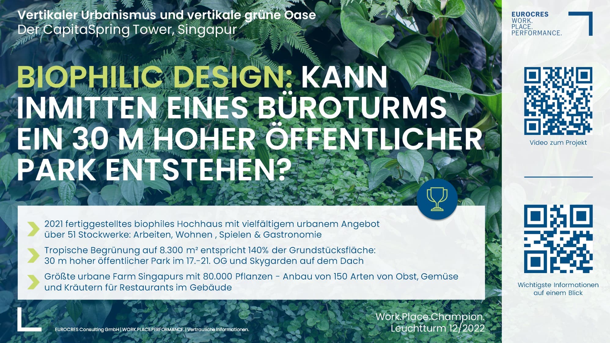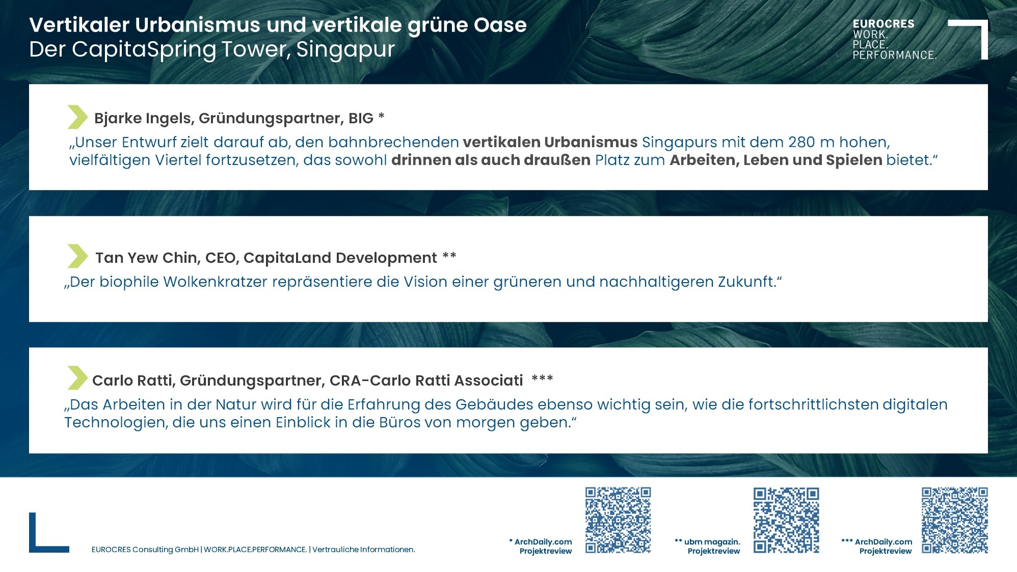 Ein 30 Meter hoher Park mitten in einem Wolkenkratzer? In Singapur ist das nicht nur möglich, sondern gewissermaßen auch vorgeschrieben: Und so beherbergt der 280 Meter hohe CapitaSpringTower ab der 17. Etage einen Park, der sich über vier Stockwerke zieht. Ein Dschungel im Großstadtdschungel und Symbol für die gemischte Nutzung aus Arbeiten, Wohnen & Spielen. Die dänischen Architekten der Bjarke Ingels Group beschreiben denn auch ihr Projekt als „biophil” – die Verschmelzung von Natur und Design. Und für die Bauherren repräsentiert der Bau „die Vision einer grüneren und nachhaltigeren Zukunft.“ Dafür steht auch die urbane Farm auf dem Dach – mit 420 Quadratmetern die größte Singapurs: 80.000 Nutzpflanzen – 150 Arten Obst, Gemüse und Kräutern – versorgen die Restaurants des Gebäudes.