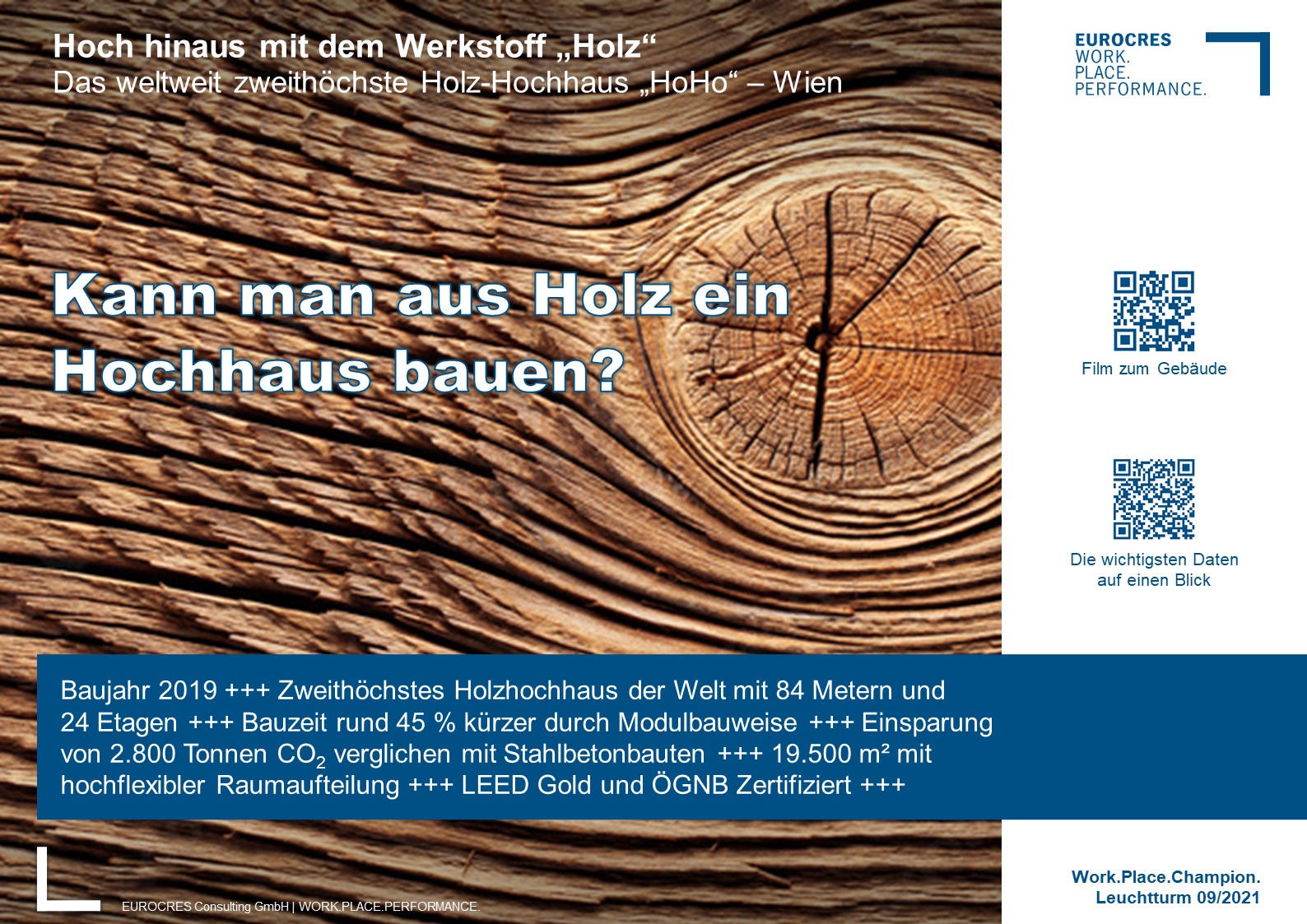 Hochhäuser sparen Platz, gleichzeitig ist der Materialaufwand pro Quadratmeter Nutzfläche größer als beim klassischen Geschossbau. Was liegt da näher, als einen nachwachsenden Rohstoff zu nutzen: Holz. Doch funktioniert das auch, wenn man 84 Meter in die Höhe baut? Klare Antworten darauf gibt das zweithöchste Holz-Hochhaus der Welt, das 2019 errichtete HoHo in Wien. Durch Modulbau konnte die Bauzeit fast auf die Hälfte verkürzt werden, während die CO2-Ersparnis gegenüber der Nutzung von Stahlbeton 20 Millionen PKW-Kilometern entspricht. Und die verbrauchte Holzmenge war innerhalb von 1 Stunde und 12 Minuten in den umliegenden Wäldern Österreichs wieder nachgewachsen.