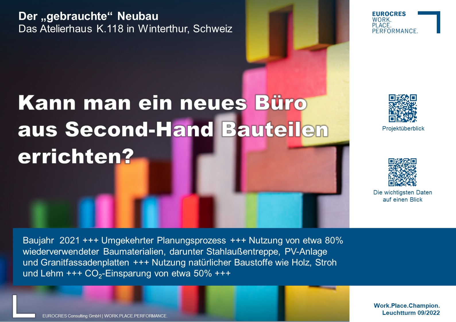 +++ Baujahr 2021 +++ Umgekehrter Planungsprozess +++ Nutzung von etwa 80% wiederverwendeter Baumaterialien, darunter Stahlaußentreppe, PV-Anlage und Granitfassadenplatten +++ Nutzung natürlicher Baustoffe wie Holz, Stroh und Lehm +++ CO2-Einsparung von etwa 50% +++