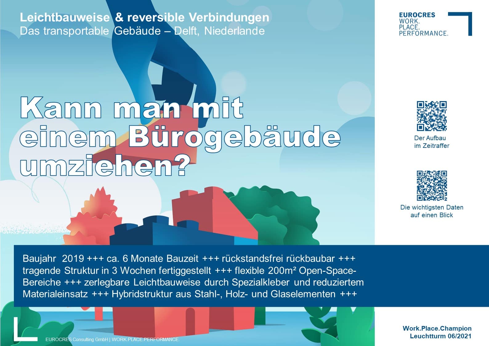 Baujahr 2019 +++ ca. 6 Monate Bauzeit +++ rückstandsfrei rückbaubar +++ tragende Struktur in 3 Wochen fertiggestellt +++ flexible 200m² Open-Space-Bereiche +++ zerlegbare Leichtbauweise durch Spezialkleber und reduziertem Materialeinsatz +++ Hybridstruktur aus Stahl-, Holz- und Glaselementen +++