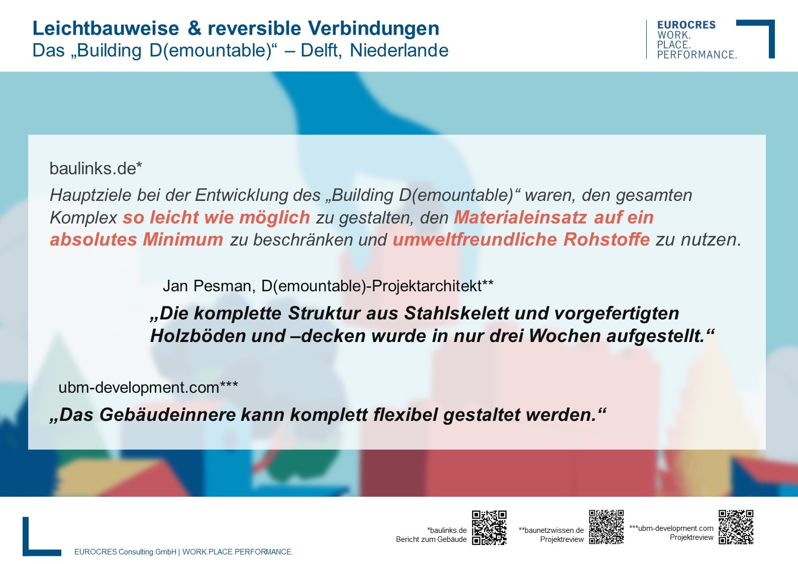 In den Niederlanden sollen alle Bautätigkeiten bis zum Jahr 2050 vollständig der Kreislaufwirtschaft unterliegen. Kein Wunder, dass mit dem Building D(emountable) in Delft nun schon unser zweites Leuchtturm-Projekt aus unserem Nachbarland diesem Gedanken folgt: ein komplett zerlegbares und wiederaufbaubares Bürogebäude – das somit selbst umziehen kann. Die Baukastenstruktur ist besonders leicht; der Materialeinsatz wurde auf ein Minimum beschränkt. Gleichzeitig ist der Bau mit seinen 200 Quadratmeter großen Etagen völlig flexibel in der Anordnung, hat keinen Gasanschluss und ist mit Wärmerückgewinnung ausgestattet.