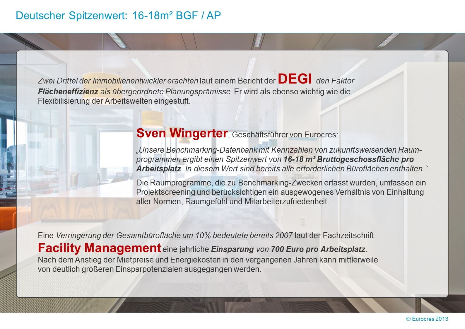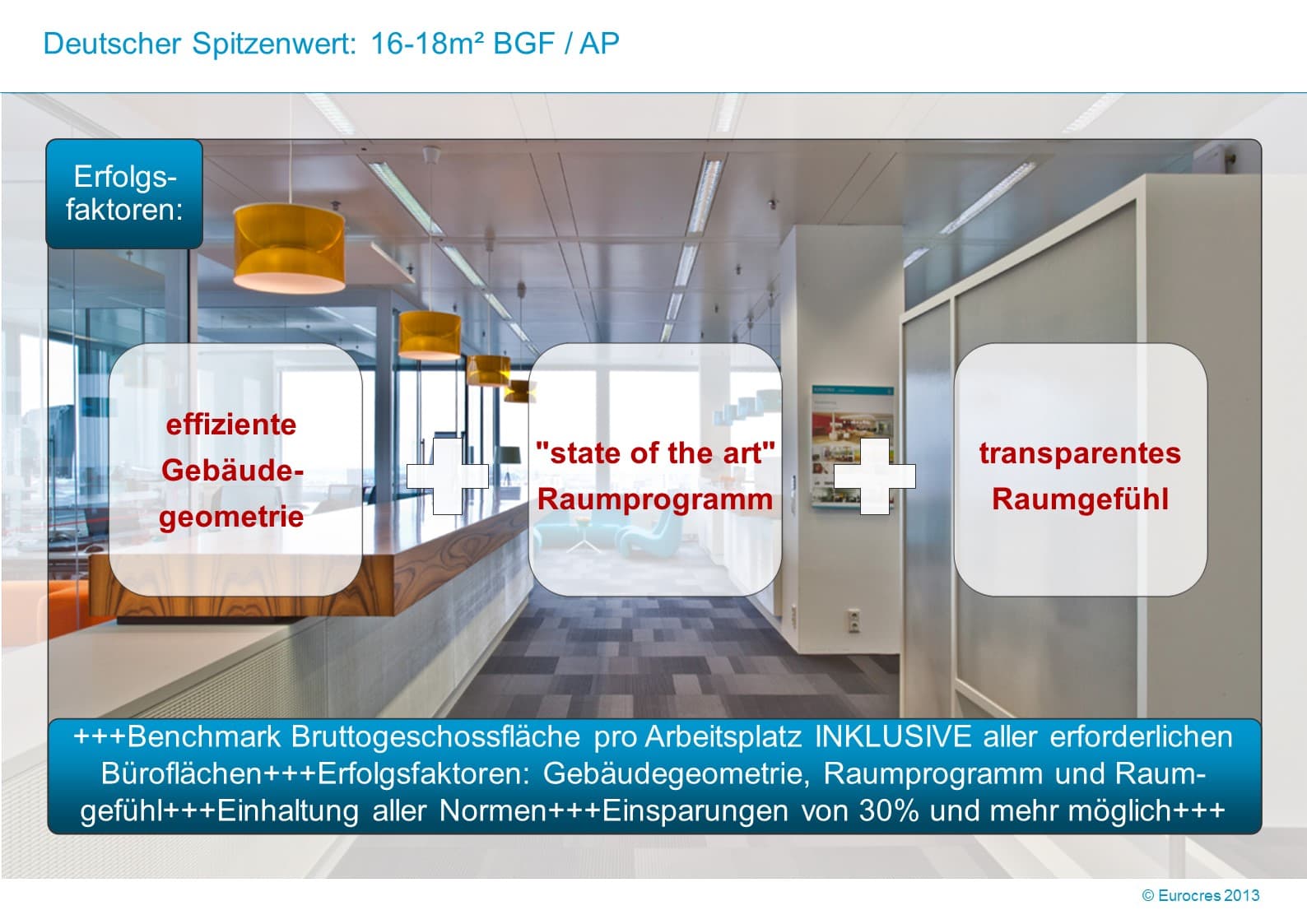 Wissensportal > Kennzahlen > Wissensportal > WorkPlace Flash: Deutscher Spitzenwert: 16-18m² BGF / AP +++ Benchmark Bruttogeschossfläche pro Arbeitsplatz INKLUSIVE aller erforderlichen Büroflächen +++ Erfolgsfaktoren: Gebäudegeometrie, Raumprogramm und Raumgefühl +++ Einhaltung aller Normen +++ Einsparungen von 30% und mehr möglich +++ DOWNLOAD DOWNLOAD WorkPlace Flash: Deutscher Spitzenwert: 16-18m² BGF / AP2013-09-192018-08-14https://eurocres.expertdeal.nl/wp-content/uploads/logo-3-weiss-np01-140905.pngEurocreshttps://eurocres.expertdeal.nl/wp-content/uploads/eurocresworkplaceflash003-prsentationsfolie-1024x768.jpg200px200px