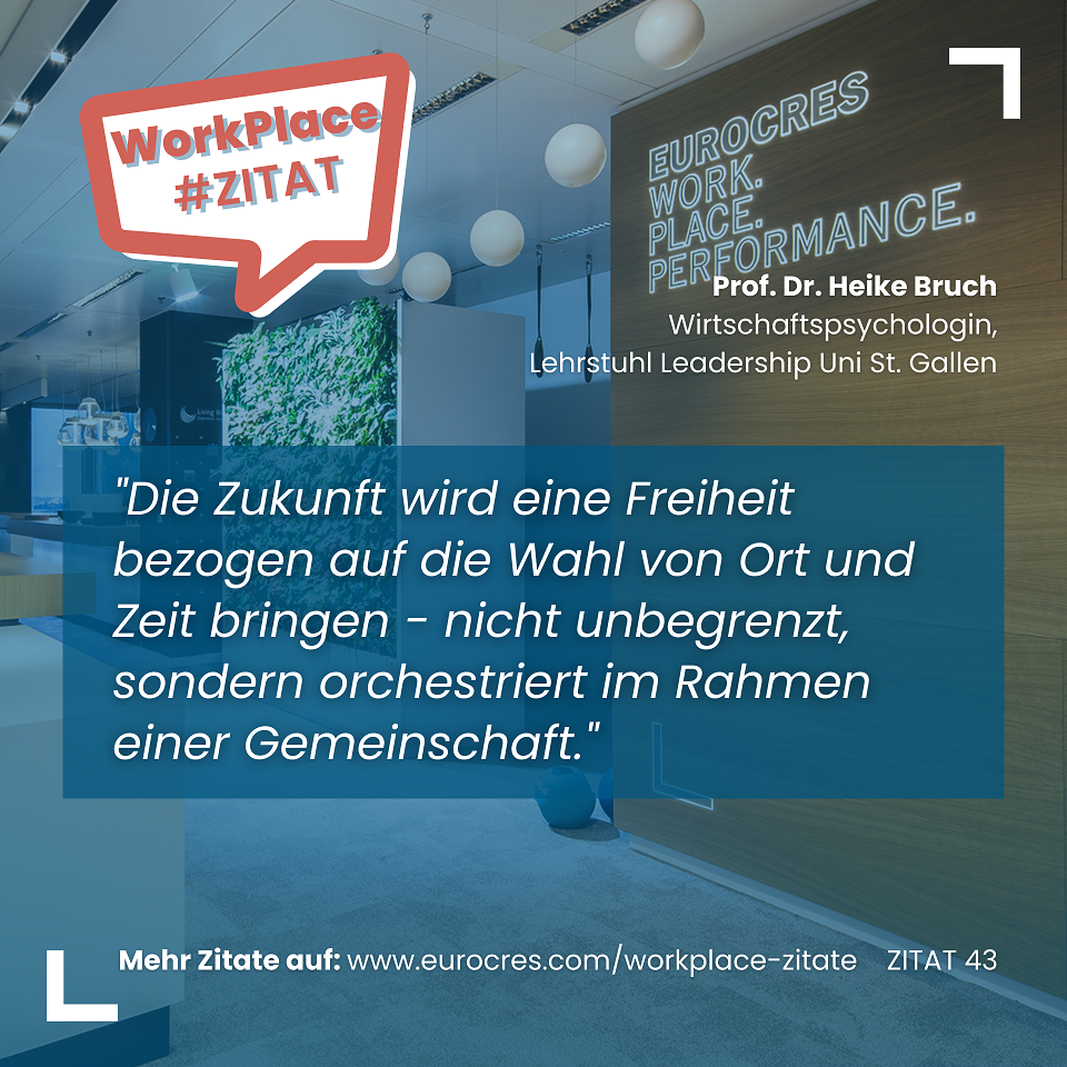 “Die Zukunft wird eine Freiheit bezogen auf die Wahl von Ort und Zeit bringen – nicht unbegrenzt, sondern orchestriert im Rahmen einer Gemeinschaft.” Prof. Dr. Heike Bruch, Wirtschaftspsychologin, Lehrstuhl Leadership Uni St. Gallen