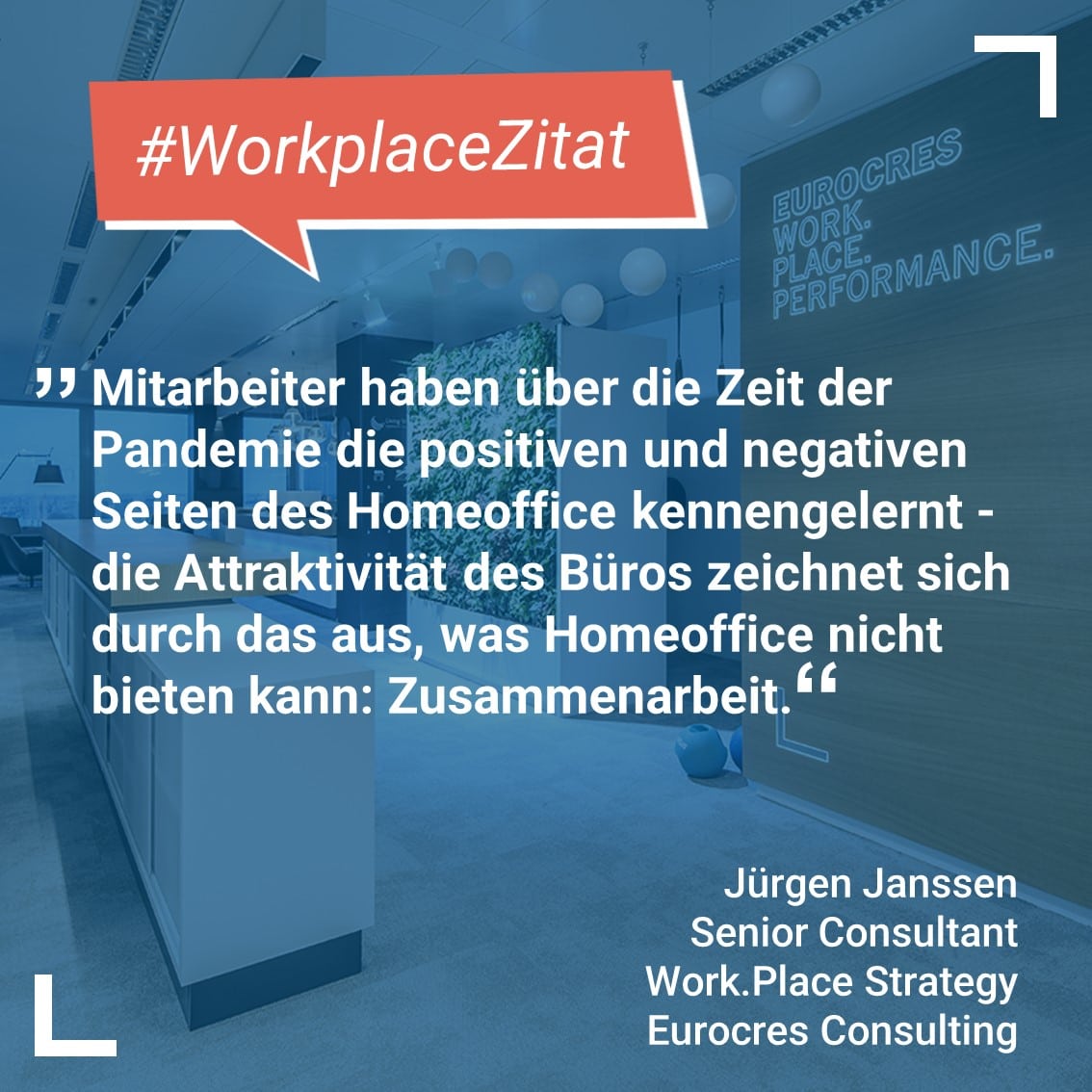 “Mitarbeiter haben über die Zeit der Pandemie die positiven und negativen Seiten des Homeoffice kennengelernt – die Attraktivität des Büro zeichnet sich durch das aus, was Homeoffice nicht bieten kann: Zusammenarbeit.” Jürgen Janssen, Senior Consultant, Work.Place Strategy, Eurocres Consulting